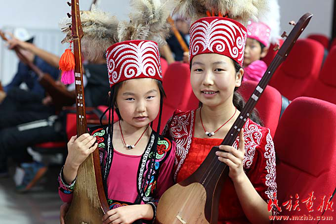 离开工作室,记者们来到了乡里的文化站,10多个柯尔克孜族孩子正在学弹库姆孜。站在一旁教学的老师是来自新疆师范大学大四的学生沙力哈尔别克·玉山巴依,学习音乐专业的他每年暑假都会回到自己的家乡色帕巴依,为孩子们教授库姆孜。他对记者说:“每次回家我都能感到孩子们对学习民族乐器的渴望。乡政府也特别支持我,提供场地和经费,能为孩子们教自己本民族的乐器,我也很高兴。”
