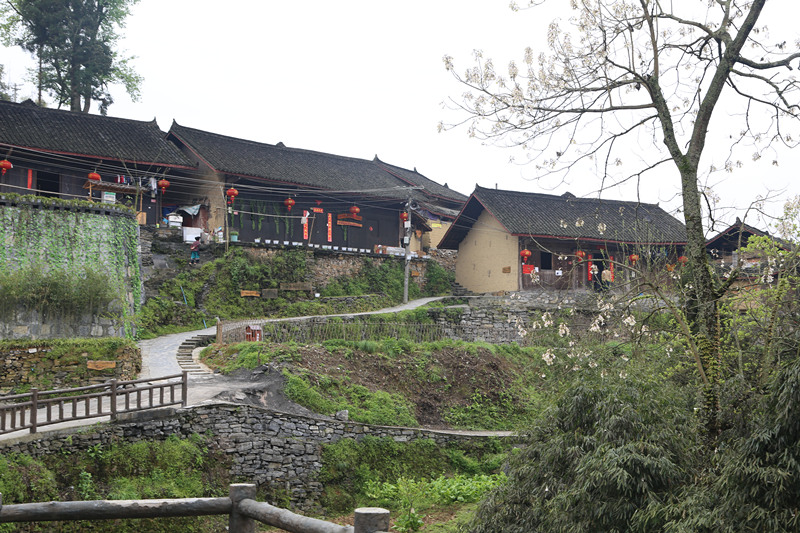 梨子寨共有28户人家,当年全寨乌黑破落的房屋如今全部修缮一新,并保持了苗族民居青瓦、木板、竹篱、黄泥墙的特色,寨子里的泥土路也铺上了青石板,屋顶、院坝、石阶、游道及田头落满了白色梨花花瓣。穿青衣包头帕的苗族女子在田间锄地、拔草,青山环抱的梨子寨无比清幽。
