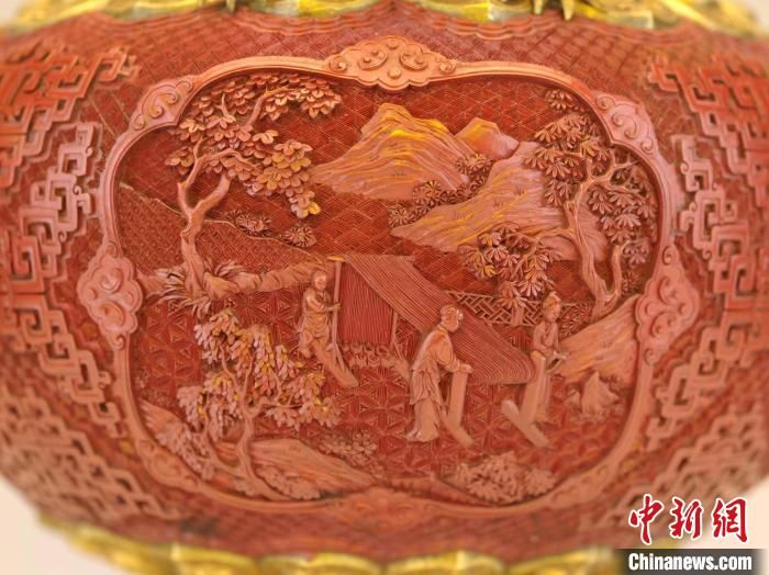 沈阳故宫博物馆敬典阁馆藏珍宝展展厅自端午假期开始展出乾隆款剔红开光山水人物纹龙耳瓶。沈阳故宫博物馆相关负责人15日表示,此文物反映了清代盛世的审美趣味,展现了中华文明之美。