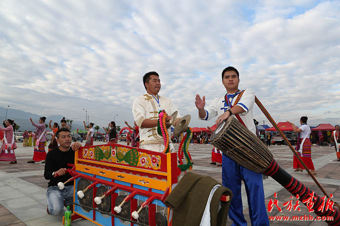 广场上,来自瑞丽市、陇川县的傣族演员跳起了噶秧舞。来自瑞丽市民间傣协会的岩保告诉记者,每年的新年庆典活动德宏州各个县市的民间傣协会都会互相往来。在傣历新年,傣族群众要用“赶摆”的方式庆祝新年的到来,并相互致以对新一年美好生活的祝愿。