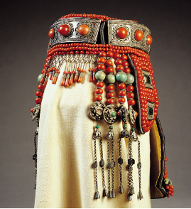 【图为清代鄂尔多斯珊瑚松石银牌链盛装头饰,中央民族大学民族博物馆馆藏】