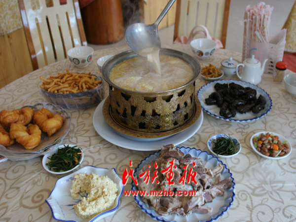 蒙古族与自然万物和谐相处的过程中创造了尚白文化,以白为美、以白为贵、以白为祥。蒙古族视白食为纯净、圣洁、吉祥的食品。每逢祭奠敖包、苏鲁锭、祖先和宗教祭祀等活动时会用大量的奶食;每逢拜年、招待宾客、喜庆宴会等活动,先以品尝白食、敬献奶酒为最神圣的礼节。每当送行时草原母亲往往敬献鲜奶,祈福路途平安。随处可见的白食、处处闻到的奶香将草原点缀得更加富饶、丰盛、和谐。