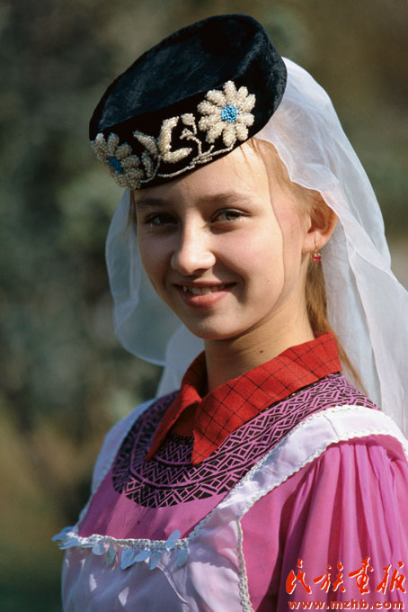 哈萨克族服饰中裙子、帽边、头巾、花边大多使用白色