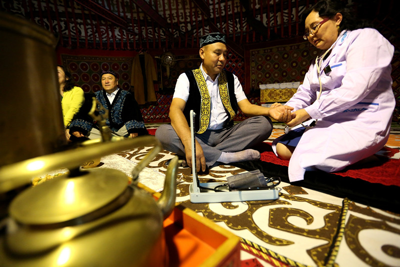 新疆阿勒泰哈萨克医医院医生库力木汗•托留汗在巡诊
