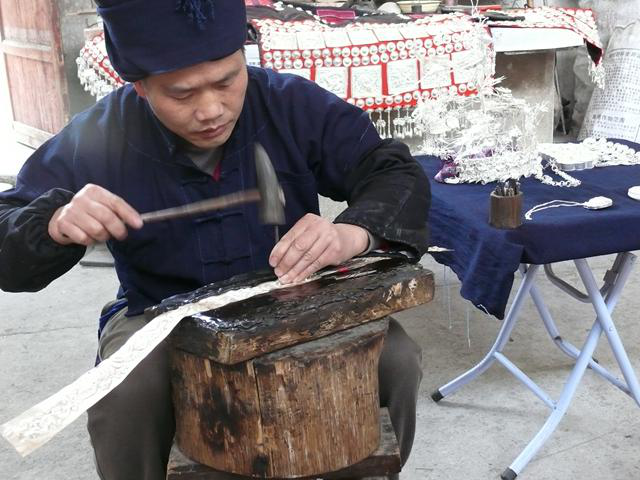 银饰锻制是苗族民间独有的技艺,所有饰件都通过手工制作而成。银饰的式样和构造经过了匠师的精心设计,由绘图到雕刻、制作有30道工序,包含铸炼、捶打、编结、焊接、洗涤等环节,工艺水平极高。