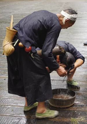 “同样是挂在后腰的竹篓,贵州岜沙苗族汉子的竹篓则少一分娇俏,多一分霸气。在距离贵州黔东南苗族侗族自治州从江县8公里的山坳上,坐落着“最后一个持枪部落”——岜沙苗寨。这里保留了古老的风貌,男子头挽发髻,身着亮布衣裤,佩刀扛枪。在岜沙男子手中,镰刀除了作为劳动工具,“镰刀剃头”的习俗更是令人称奇。因此,挂在腰上镰刀篓子也就成为了当地男性的随身配件。这种竹篓呈靴形,篓身的弧度与镰刀完美契合,如此一来,镰刀入篓后,既不易掉出、不易划伤,又轻巧便捷,好不威风!”