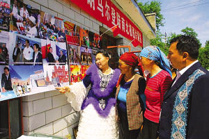 各族群众观看胡斯马义·沙胡马尔登陆南北极图片展览。