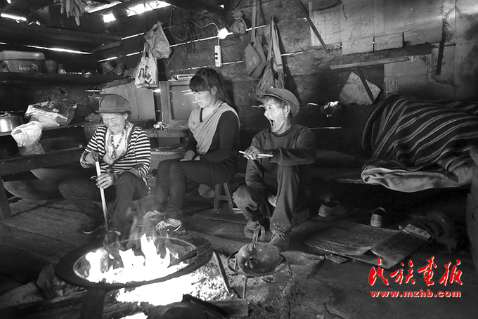 木垒房里,独龙族一家人围坐在火塘边烤火