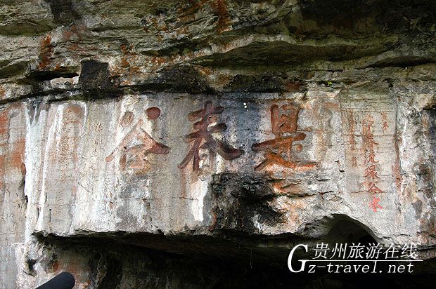 “是春谷”摩崖长20米,高3米,约2万余字,名为《洗心泉集》,从经史集成的诗章共46首,670佘行。所集之书包括易、书、诗、春秋、三礼、四书、孝经、尔雅、楚辞、汉、魏、晋、刘宋、南齐、北、周、隋、唐、五代、宋、金、辽、元、明以及时贤黔宦,黔人等各时代著名书籍。每字约4,5厘米见方,欧体楷书工整秀丽,为贵州摩崖上乘之作。“白苎春流环谷水,青山高咏属宣城。”游山玩水间,咏此诗句,别有韵味。