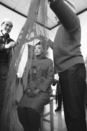 结婚之日,新郎朱永龙准备好接亲车,因为女方家住得远,他提前出发了。女方家在结婚这天,请人用线绞去新娘脸上的汗毛,俗称“扯脸”。新娘马燕穿上了红色衣服,以示吉利,并洗大净(伊斯兰教净礼之一,即用清洁的水清洗全身),这叫“离娘水”。出发前,新娘头上蒙上了一块红纱,同时,女方家还要从亲戚朋友中请夫妻和美、儿女双全的人来送亲。