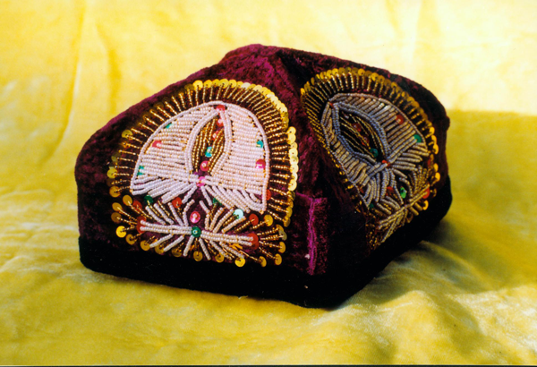 此外,维吾尔族花帽更是具有浓重的维吾尔特色,男女均可佩戴。古代人们佩戴花帽主要用于抵御风寒,现代维吾尔人佩戴各类花帽则主要起到装饰作用。维吾尔花帽造型多样,其图案花纹也各有不同,主要有以下几类:巴旦姆花帽、塔什干花帽、格来木花帽、曼波尔花帽、奇曼花帽、再尔花帽、玛日江朵帕、金片花帽、吐鲁番花帽、伊犁花帽、夏帕克帽、赛里甫西吐玛克。