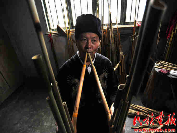 莫师傅在对两个芦笙进行高低音的和谐调试