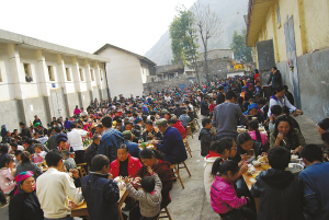 到了下午三四点左右,坝坝宴就摆开了。抬桌子的、端板凳的,个个忙得不亦乐乎,但都是乐呵呵的。待所需要的一切都准备好了,就等总指挥发话。