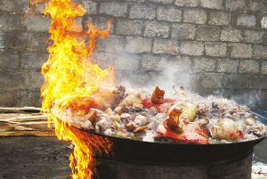 话音未落,帮忙的小伙子就端肉、端汤、摆酒,姑娘们跟着摆碗、盛饭。客人蜂拥而来,热闹地抢着座位。吃饭如同打一场歼灭战,必须先下手为强,迅速占领阵地。抓一块砣砣肉在手上,大口嚼着,如果肉冷了,就舀上一马勺儿用彝族土法腌制的酸菜汤喝下肚,真是美味可口。