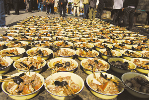 每年秋收后到翌年播种前,是四川凉山金阳县人结婚的黄金季节。无论是在县城还是农村,不管是吃“九斗碗”,还是吃“坨坨肉”,大家都喜欢摆坝坝宴。在金阳县城,常常可以看到这样一幅景象:数百人聚在一处,围坐于一张张方桌旁,伸箸畅食,举杯畅饮。一盆盆肉端上桌子,主人不停地招呼客人趁热吃。
