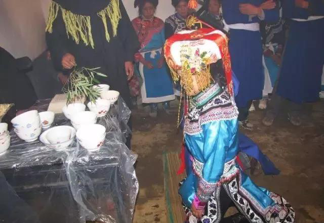 2、源自于民族歌舞文化习俗。彝族是个能歌善舞的民族,自古就有以歌作媒,用歌表达对异性的爱慕和追求的传统。相传,彝族先祖笃弥时,洪水淹没了世界,而笃弥按照天神策举祖的授意,躲进自造的木桶中幸免于难,成了世间的独人。天神为了不让人种在世间灭绝,于是就安排天上三仙女尼友咪比、娄友咪多、吞友武吐下凡到人间,在呗谷恳嘎这地方设歌场,与笃弥唱歌又跳舞,谈情又说爱。整个歌场上,热闹不一般:天上的仙女,成群来歌场;野人拿舞具,老虎打灯笼;人熊吹芦笙,欢聚在歌场。彝族的先祖,就是通过歌舞迎得了仙女的欢欣的而成就婚姻而繁衍了彝人的。从此,彝族青年谈情说爱、谈婚论嫁,都离不开歌舞。歌舞逐渐地融入了婚礼场中,与婚礼上的各种仪式进行对接和植入,通过上千年的发展,就形成了“阿买恳”。“阿买恳”中的“阿买”指未婚女子,“恳”有“歌舞”、“跳舞”之意。如“呗谷恳嘎”中的“恳嘎”就是歌舞场坝的意思;“恳合”(铃铛舞蹈)中的“恳”也有跳的意思;还有“恳咪”,指的是关于歌舞的诗文。可见,“恳”(歌舞)的内容是相当丰富的,因而彝族出嫁时有出嫁歌,这完全是在情理之中的。