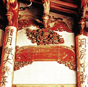 畲族的古老民居都是深宅大院,堂屋高大、宽敞,也是装饰的重点,神龛、窗棂都有镂空木雕和浮雕装饰。堂屋依木柱用木板隔间,板壁上露出半圆的木柱,在对应的木柱上贴着红纸浓墨的对联——每逢新婚、祝寿、春节等重大节庆都要贴对联。