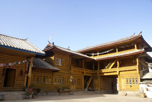 纳西族的民居在民国时期普遍呈“用圆木纵横相架,层面高至七、八尺,即加椽行,覆之以板,石压其上”的“木楞房”形制。通常的情况是,在木楞房的正房(祖房)纳西族称为“吉美”(意为母房)中,有一个纳西语称为“格古鲁”的高出地面的灶台,有家神供其上。中间为火塘,安置大型铸铁制三脚架于其上,用以烧水、做饭和取暖。会客、聚餐和老人就寝都会在中间的灶台上。这种普遍的房屋式样以及室内设置在广大山区和香格里拉三坝、宁蒗永宁目前还普遍流行,当然现在的房子已经比以前高大宽敞了许多。