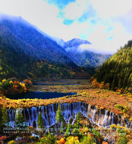 九寨沟是大自然鬼斧神工之杰作。这里四周雪峰高耸,湖水清澈艳丽,飞瀑多姿多彩,急流汹涌澎湃,林木青葱婆娑。蓝蓝的天空,明媚的阳光,清新的空气和点缀其间的古老村寨、栈桥、磨坊,组成了一幅内涵丰富、和谐统一的优美画卷,历来被当地藏族同胞视为“神山圣水”。九寨沟景区开放后,东方人称之为“人间仙境”,西方人则将之誉为“童话世界”。