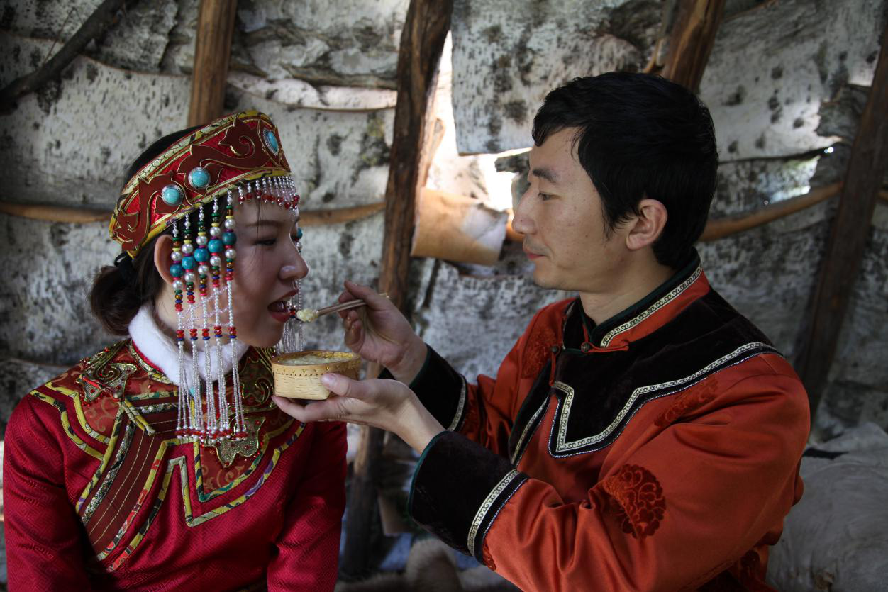 婚期来临,男方同族兄弟姐妹组成声势浩大的接亲马队,簇拥着新郎前往女方的家里迎娶新娘。新娘进入男方“乌力邻”的时候,男方父母捧出美酒敬献送亲的新娘长辈,然后双方的长辈被请到预先设置好的婚礼场地就坐,新郎新娘在主持人的引导下跪拜南天,新娘拜见公婆,新郎新娘跪拜所有长辈。婚宴开始前,男方家长要向火神敬献酒肉。婚宴中,新郎新娘吃肉要用一个盆盛,用一刀割,酒也要用一个碗喝,象征夫妻同甘共苦、永不分离。次日晨,新郎新娘要向出生的太阳磕头祈祷,祈求太阳给他们温暖,让他们幸福。早餐后女方送亲的人准备返回,新郎新娘要向它们敬酒送别,祝他们一路平安。女方亲友喝完饯行酒后,往往把酒杯揣入怀中,催马疾驰而去,男方亲友纷纷跨马急追,想方设法将酒杯夺回来,否则认为是男方无能。