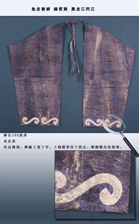 套裤的形式只是两个筒形裤腿,没有裤腰,男式的上端为齐口,女式的上端为斜口。赫哲族人称男式鱼皮套裤为 “卧又克衣”,裤边口有皮条,是用来扎结用的。赫哲族人称女式鱼皮套裤为“嘎荣”,口呈月牙形状,前边到腰部,后边到大腿根部。如图所示,女式鱼皮套裤,长105厘米,裤腿上宽下窄,上端系有缀带,裤脚缀有“S”形纹饰。鱼皮裤造型与普通裤子基本一致,裤腰和裤裆部较为宽松肥大,裤腿稍窄些。