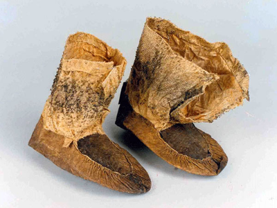 鱼皮靴俗称鱼皮靰鞡,由鱼皮四周整体向上折起,抽褶向上形成底部,前面与鞋脸缝制在一起,形成半圆形,鞋口再用另一块鱼皮缝上,形成圆筒形靴靿,然后穿绳或皮条做鞋带。此鞋由身、脸、黝三部分组成。鱼皮鞋既结实保暖,又抗寒防水防滑,适于在冰上和泥泞道路上行走及从事渔猎生产。如图所示。