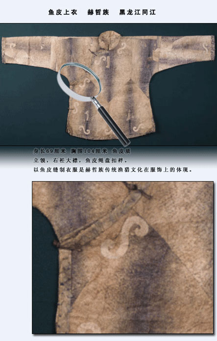 赫哲族的鱼皮衣历史久远。我国古代文献《山海经》第九卷《海外东经》中便有“玄股之国,在其(黑齿)北,其为人衣鱼食鸥” 的记载。“衣鱼”西晋学者郭璞解释为“以鱼皮为衣也。”说明早在两千多年前,赫哲族的先民就已使用鱼皮做衣服了。另据密山新开流新石器时代遗址中出土的鱼叉及骨针,证明赫哲族的先民捕鱼和缝制鱼皮衣有数千年历史了。清代张晋彦的《宁古塔山水记》有:“鱼皮部落,食鱼为生,不种五谷,以鱼皮为衣,暖如牛皮”的记载。《皇清职贡图》记载:“赫哲衣服多用鱼皮而缘以色布,边缀铜铃,亦与铠甲相似。”另外,地方志书对此也多有记载。可见,赫哲族制作和穿着鱼皮衣是真实而久远的。