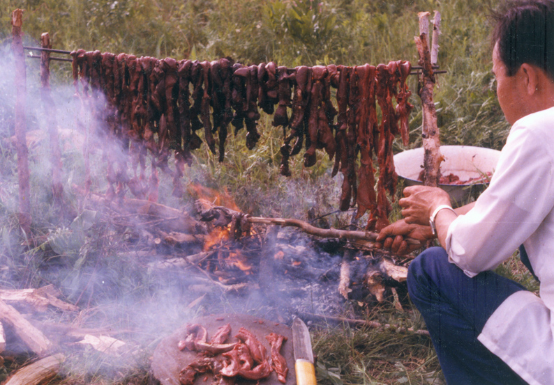 肉食分为家畜家禽和野兽野禽以及鱼类等,吃法有晒、煮、烤等,但是不炒,其中“手把肉”最为著名。布特哈、齐齐哈尔、瑷珲等地达斡尔族因定居普遍养猪,年节时宰杀。布特哈地区因狩猎还占有一定比重,肉食以袍子及野猪等兽肉为主。