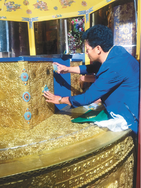 2011年,我区全面启动大昭寺金顶维修工程,朵普·次嘎积极参与到大昭寺金顶修缮保护工程当中。 图为大昭寺金碧辉煌的金顶。