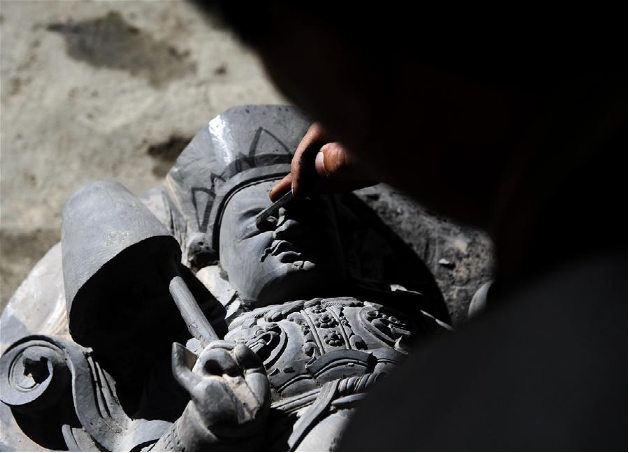 伴随着收音机传出的旋律,西藏自治区级黑玉石雕刻技艺非物质文化遗产传承人土登加措和他的徒弟们开始了又一天的黑玉石佛像雕刻工作。黑玉石产生于海拔4500米以上的石山上,是高原特有的一种石材。据古书记载,西藏第一代藏王聂赤赞普曾将天降的经书、塔模等佛教圣物封存于洞中,并以黑玉石雕刻佛塔做盖,于是便有了西藏历史上有记载的第一件黑玉石雕刻作品。作为这门技艺的第五代传人,土登加措延续着家族的技艺,一直传承着这门古老的技艺。西藏黑玉石雕刻技艺在2012年入选第四批西藏自治区级非物质文化遗产名录,土登加措如今已有近30名弟子,古老的黑玉石雕刻技艺正在慢慢走向世界。新华社记者 晋美多吉 摄
